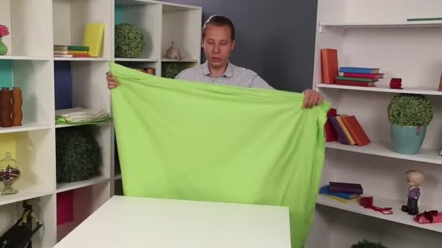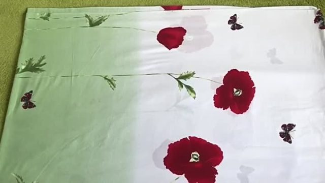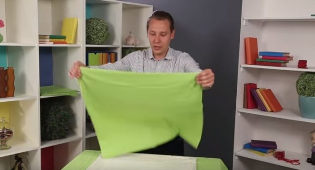 - Coloque a capa de edredão sobre a mesa, alise-a com as mãos para que não haja vincos e dobre-a em quatro.