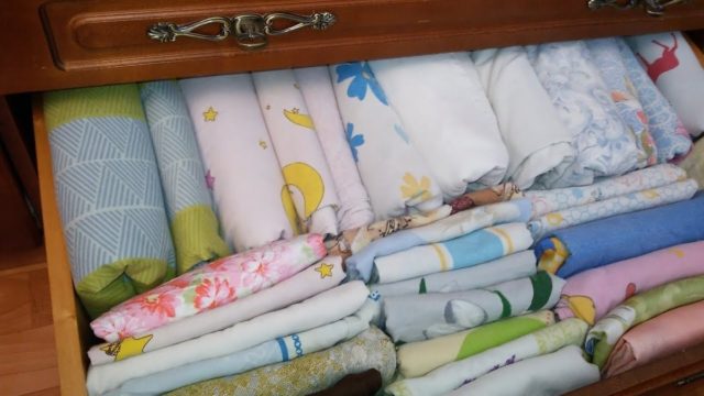 Tal sistema de armazenamento não implica o método horizontal usual de colocar roupa de cama em uma prateleira, mas um método vertical. Os kits são dobrados de qualquer maneira conveniente e posicionados como livros. Esse método funciona bem para gabinetes estreitos com muitas prateleiras.