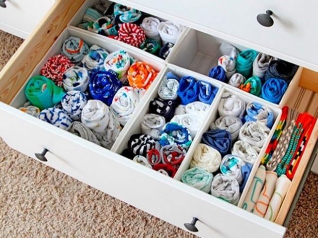 É mais conveniente dobrar os tecidos em uma cômoda verticalmente. As gavetas são estreitas e profundas o suficiente, todos os kits serão visíveis. E é muito fácil obtê-los, sem ter que quebrar toda a linha. A ordem em tal cômoda permanecerá por muito tempo.