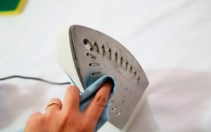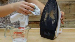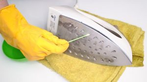 É necessário umedecer um pano macio ou algodão no solvente e, em seguida, esfregar a sola do aparelho por vários minutos até que a incrustação seja completamente removida. Em seguida, o ferro deve ser lavado muito bem com uma esponja úmida e seque.