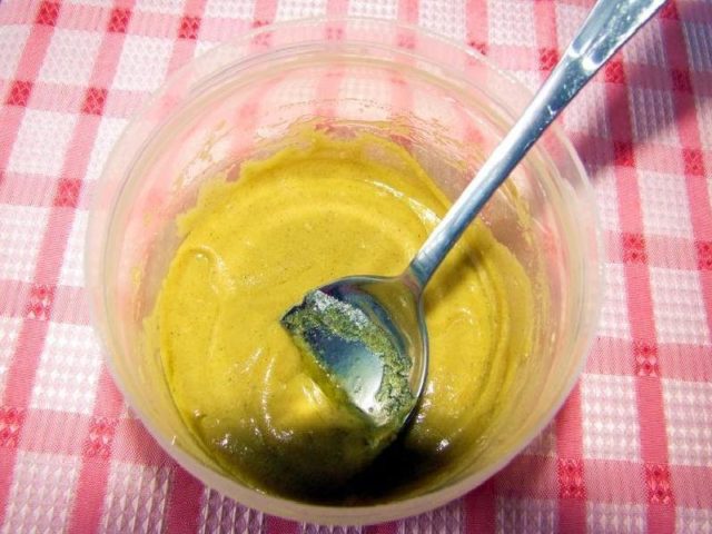 - A mostarda em pó é adicionada gradualmente à mistura resultante, mexendo constantemente a massa. Deve ter a consistência de creme de leite.