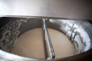 - Soro de leite azedo é adicionado gradualmente ao leite. Após a mistura, o conteúdo é coalhado.