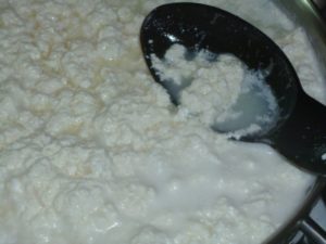 - o leite é levado à fervura, após o que a coalhada é colocada nele. O conteúdo deve ferver novamente. Deixe no fogo por 25-30 minutos, mexendo sempre;