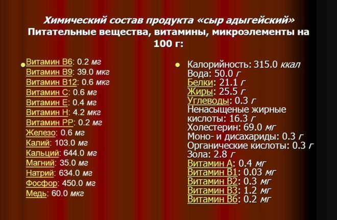 O conteúdo calórico do queijo Adyghe por 100 g é de 225 kcal. Além desses componentes úteis, o queijo Adyghe contém aminoácidos, vitaminas e outros nutrientes.