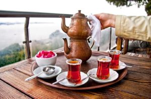 Em casa, o chá é preparado fervendo. Na Turquia, o chá costuma ser servido com doces orientais, açúcar, frutas.