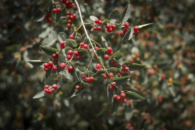 Um arbusto ereto cresce até 2,5 m de altura. A planta pode ser reconhecida por suas pequenas folhas verdes brilhantes de até 3 cm de comprimento, pálidas por baixo. O arbusto floresce no final de maio com inflorescências amarelas e, no meio do verão, dá frutos - drupas esféricas vermelhas, que costumam crescer juntas na base.