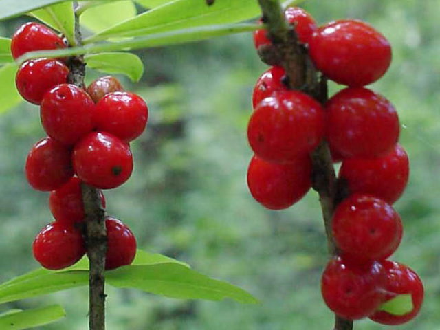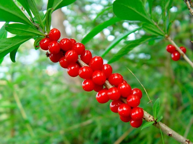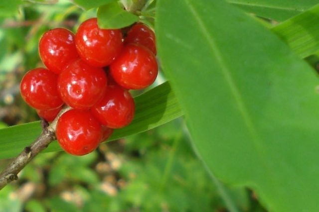 A planta wolfberry ou wolf bast, assim como a daphne, é um arbusto baixo de tipo perene com cerca de 1,5 m de altura e folhas oblongas verdes escuras. Na primavera floresce com pequenas flores brancas e rosadas, e no outono dá frutos ovais de um vermelho vivo com uma pedra, ligeiramente semelhante às drupas de bérberis. Além disso, os frutos não ficam nos talos, mas diretamente nos galhos.
