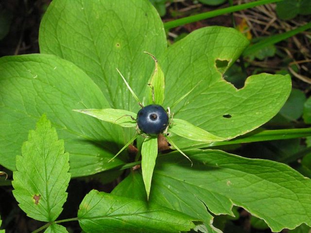 Uma planta perene chamada olho-de-galinha cresce em uma haste reta e grossa de até 50 cm e geralmente tem 4 grandes folhas verdes claras dispostas em forma de cruz. Acima das folhas do olho-de-galinha em junho ou julho, surge uma flor verde, composta por quatro sépalas e pétalas. Em agosto, o olho-de-corvo dá uma única fruta - de cor preta, com uma flor azulada.