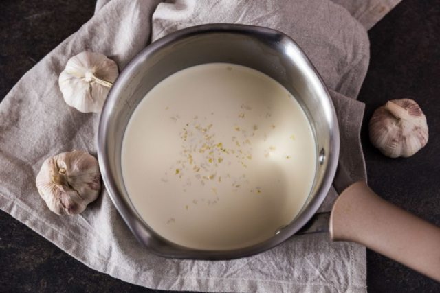 Para fazer leite de alho medicamentoso, você precisa moer dois dentes de alho descascados com um liquidificador ou faca. O mingau é adicionado ao líquido e levado para ferver.
