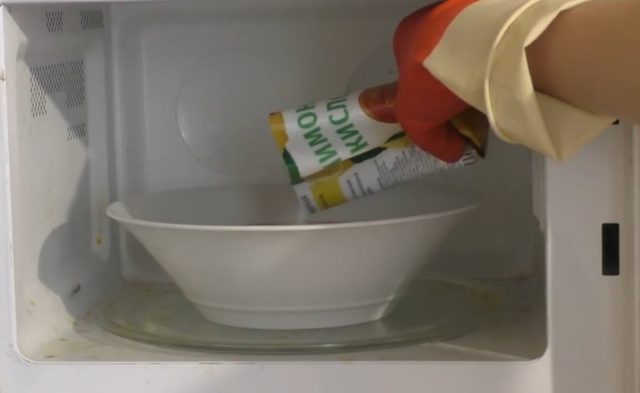 Etkiyi arttırmak için, bileşime narenciye suyu ve kabuğu ekleyebilirsiniz. Çözeltiyi hazırlamak için 500 ml suya, bir çorba kaşığı aside ihtiyacınız olacak. Kompozisyon ayrıca limon suyu (4 yemek kaşığı) içerir. Çözeltili bulaşıklar mikrodalgaya yerleştirilir ve maksimum güce ayarlanır. Cihazın çalışma süresi 2 ila 5 dakikadır.