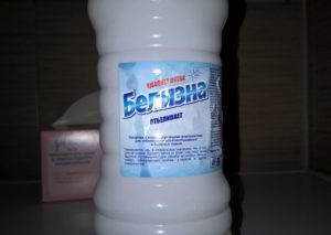 - «Beyaz". Bu ürün aynı zamanda beyazlatma etkisine sahiptir, bu nedenle sadece açık renkli malzemelerden küfü çıkarmak için kullanılabilir. 50 ml "Beyazlığı" 1 litre suda çözün. Elde edilen sıvıda bir pamuklu çubuğu nemlendirin ve lekeleri iyice silin, 20 dakika bekletin. Temizledikten sonra, kapağı birkaç kez yumuşatıcı ile durulayın.