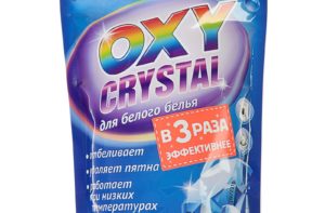 - «Oksi Kristal". Bu ürün aynı zamanda klor içermez, bu nedenle renkli malzemeden küfün çıkarılmasına yardımcı olur. Uygulama prensibi önceki araca benzer.