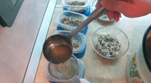 - Küçük tepsiler halinde düzenleyin, gerekli miktarda et suyu ekleyin, bir elekten süzün.