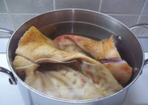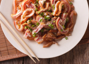 - Haşlanmış kulak kepçeleri ince şeritler halinde kesilir.