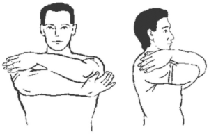 - "Хвани раменете си" прави, докато стои. Свити ръце са повдигнати до раменете. На остър дъх ръцете се събират, сякаш са в прегръдка. При издишване - разредете възможно най-широко.