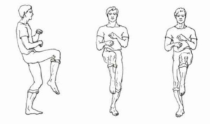 Стоейки прав, повдигнете десния крак, сгънете коляното. Палецът е издърпан надолу. Левият крак е леко обърнат, седнал, докато вдишвате. Издишвайки сменете краката.