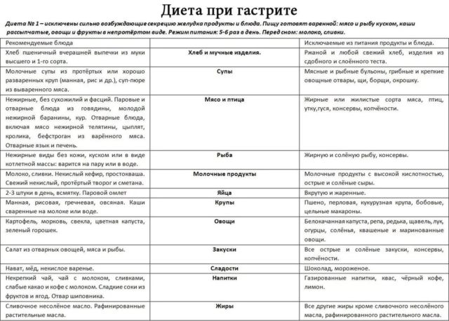 При гастрит с висока киселинност се предписва таблица номер 1. Диетата изключва месни и рибни продукти с високо съдържание на мазнини, пушени меса, кисели краставички, домашно приготвени консерви, сосове и подправки. Не пържете храни, храни с високо съдържание на фибри.