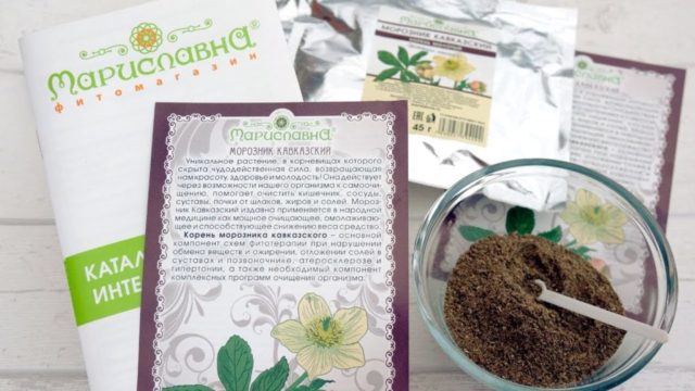 - Често, заедно с буркан, който служи като опаковка за натрошени суровини от кавказки морозник, в комплекта е включена и мерителна лъжица. Схемата за приемане е приблизително същата като в предишния случай. Първите 10 дни, приемайте по една лъжица на гладно сутрин, половин час преди хранене, и увеличавайте по една всяка седмица. Така че дозировката трябва да достигне 200-300 mg (в 1 лъжица - 50 mg). След това направете почивка за един месец и продължете лечението отново, като повторите същата схема.
